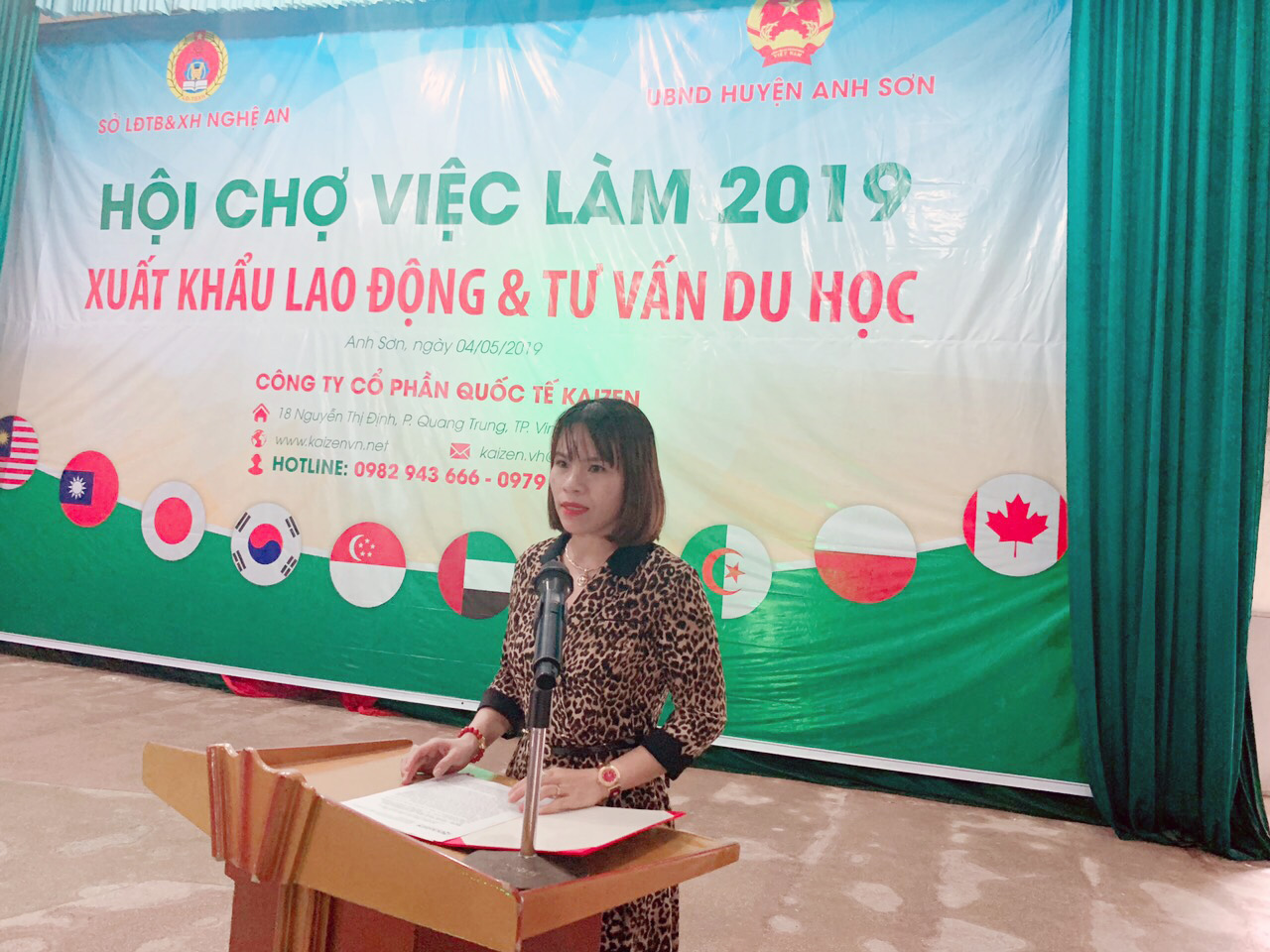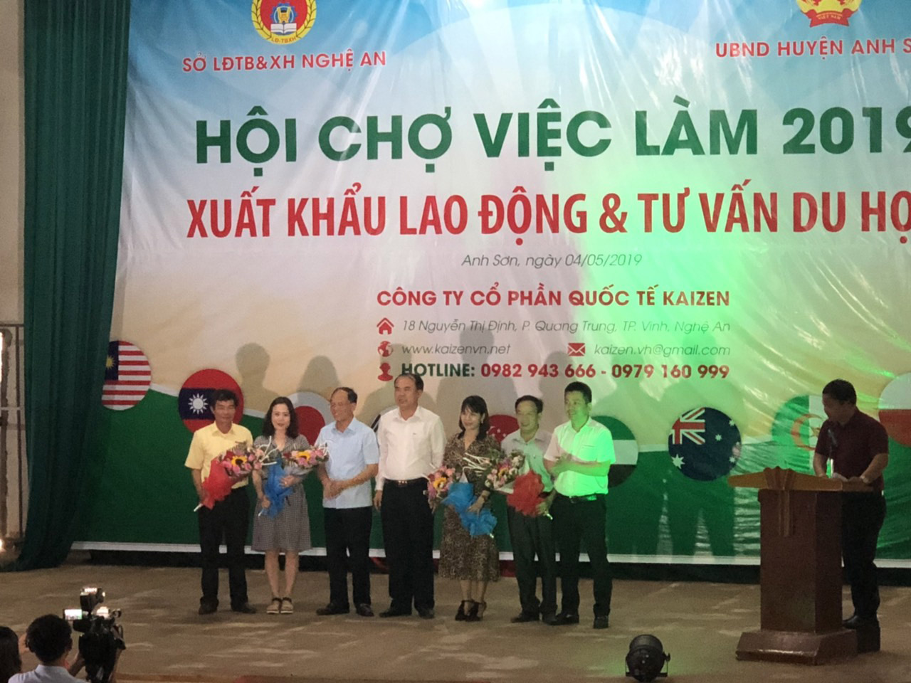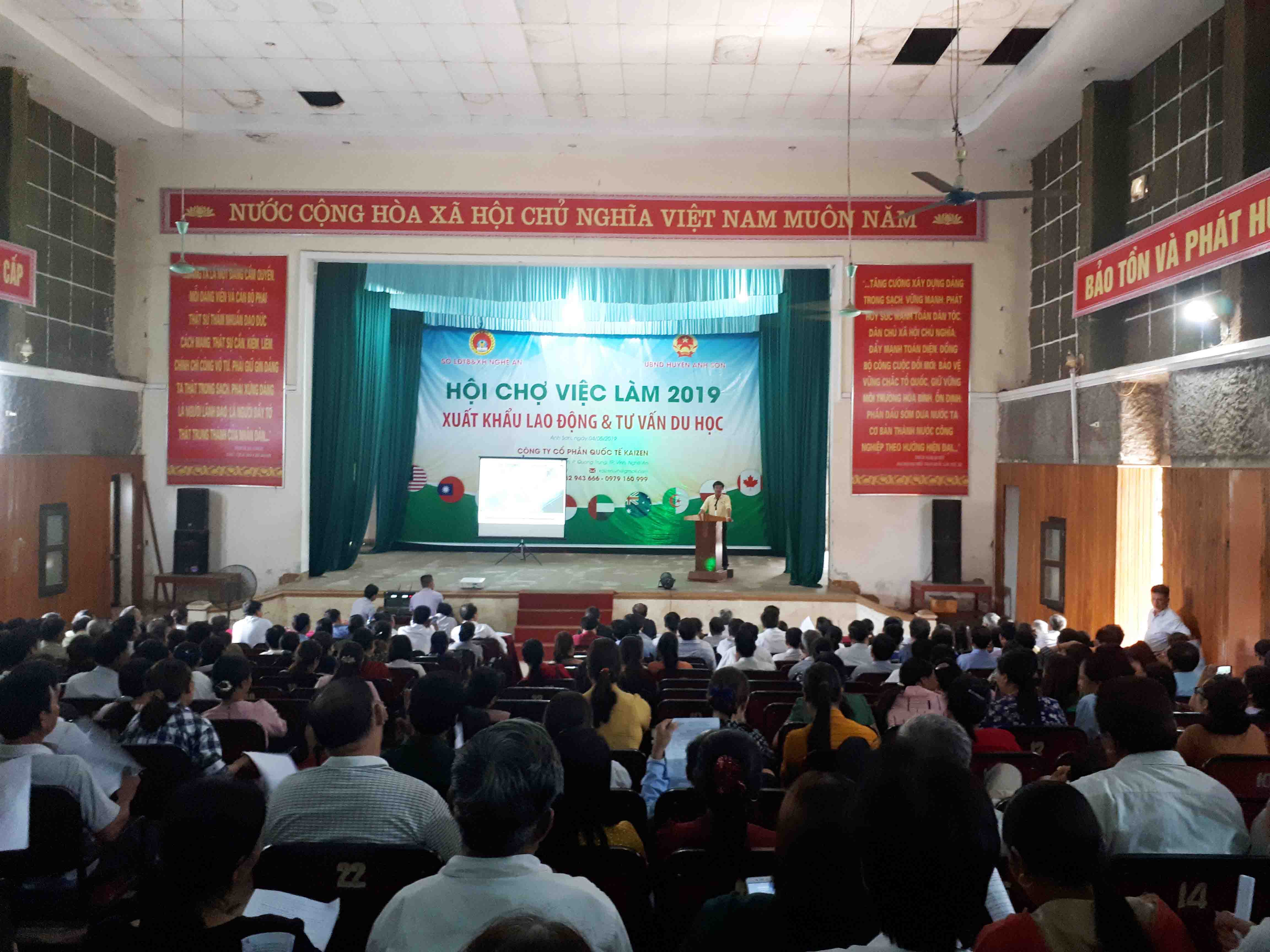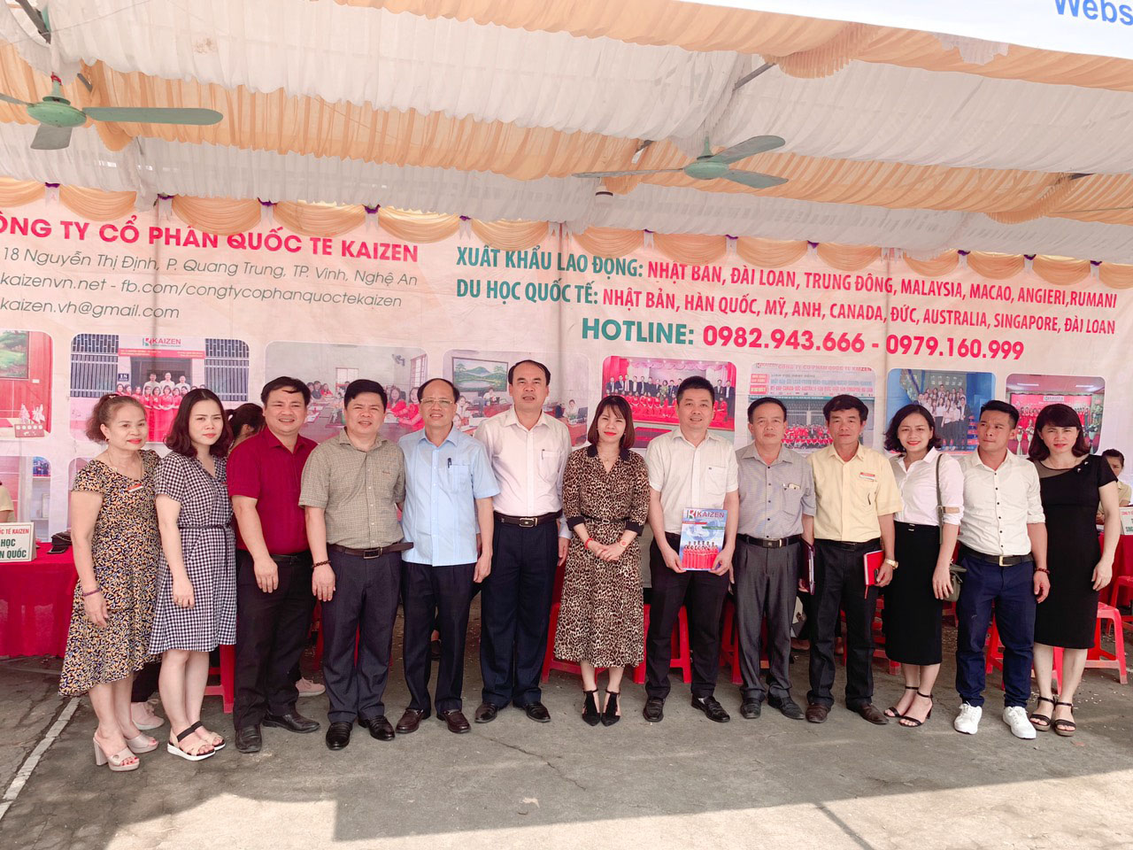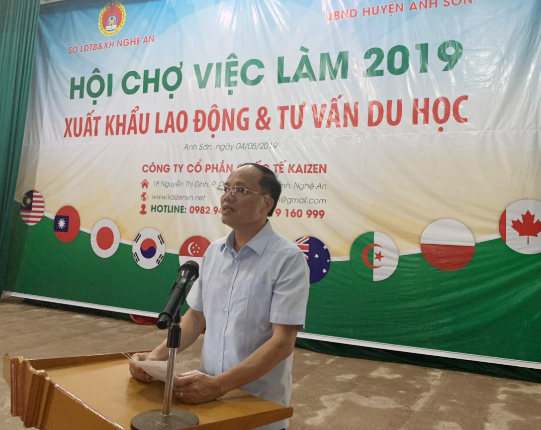 Được sự chỉ đạo của Sở LĐTB&XH tỉnh Nghệ An, ngày 4/5/2019 Công ty CP Quốc tế Kaizen đã phối hợp với UBND huyện Anh Sơn tổ chức “Hội chợ việc làm 2019” tại Trung tâm văn hóa huyện Anh Sơn. Đây là cơ hội để người lao động và các em học sinh trong huyện Anh Sơn được tiếp xúc trực tiếp và tìm hiểu các chương trình XKLĐ và du học phù hợp.