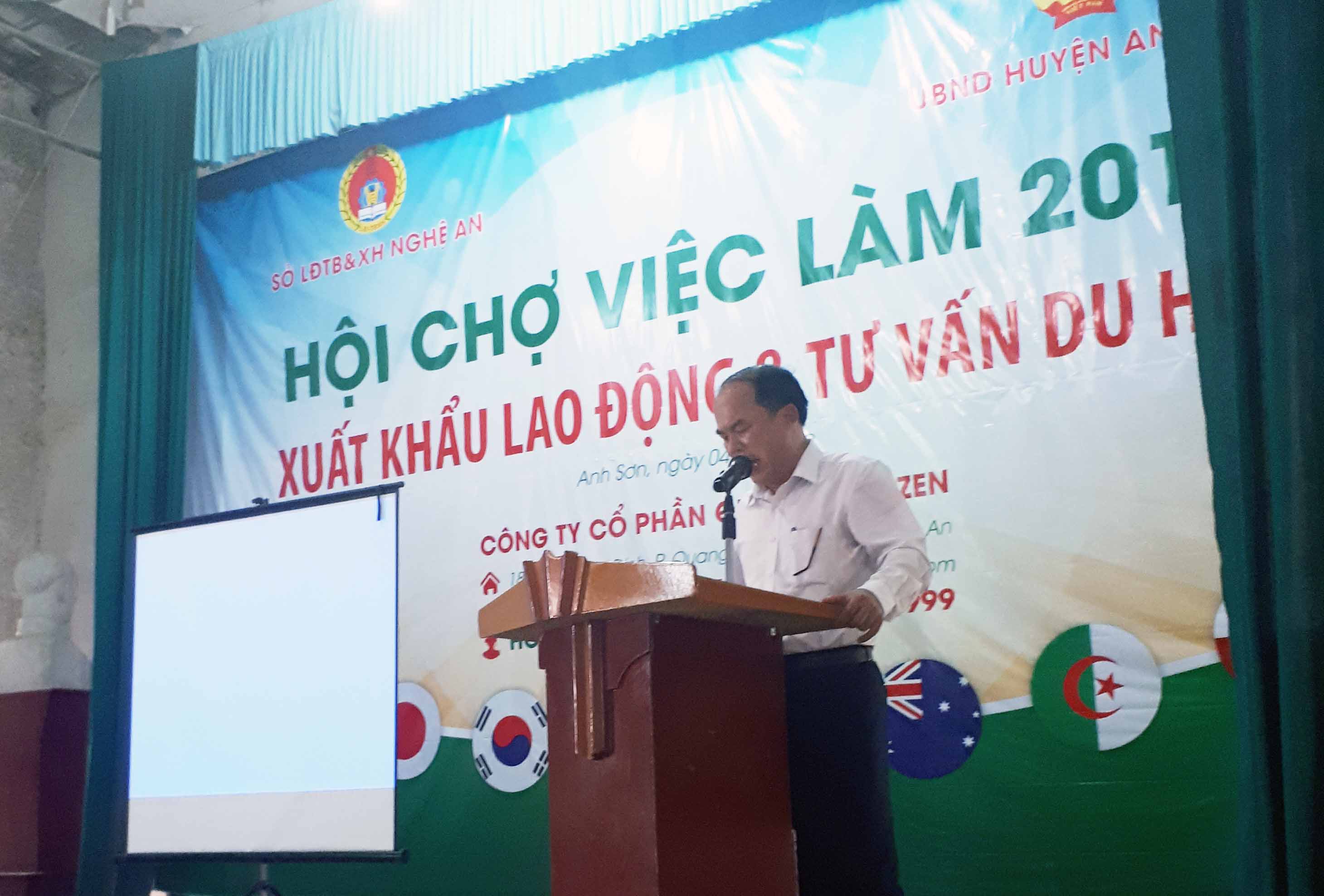 Mở đầu buổi lễ ông Đặng Xuân Quang - Phó chủ tịch UBND huyện Anh Sơn lên phát biểu khai mạc buổi lễ cũng như báo cáo công tác XKLĐ trên địa bàn huyện năm 2018 và kế hoạch định hướng năm 2019. Ông cũng hy vọng thông qua buổi hội chợ lần này những người lao động và các em học sinh trên địa bàn huyện sẽ trang bị cho mình những kiến thức bổ ích để có sự lựa chọn phù hợp cho bản thân.