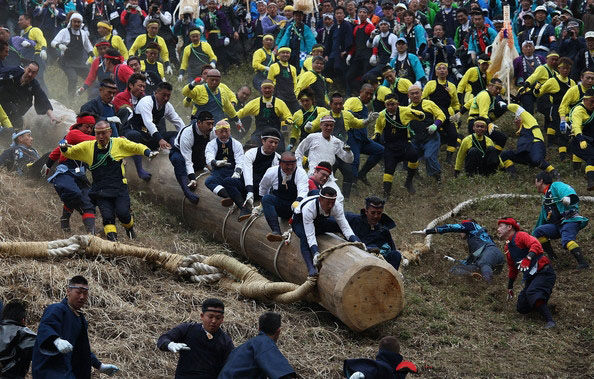 Những người đàn ông trẻ tuổi chứng minh sự dũng cảm của họ bằng cách trượt các cây này xuống ngôi đền "Satobiki". Tất cả những nguy hiểm đó không làm nao núng tinh thần của mỗi người tham gia bởi họ tin vào sự che chở của thần linh. Lễ hội này luôn đem lại sự hồi hộp cho khán giả và sự phấn khích của những thành viên tham gia lễ hội.