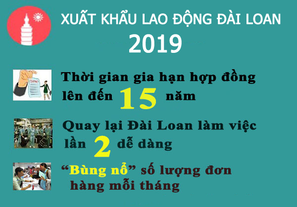 Theo nhận định từ các chuyên gia trong ngành thì năm 2019 sẽ là năm “bùng nổ” đơn hàng đi Đài Loan. Thực tế cho thấy, số lượng đơn hàng mà công ty chúng tôi tiếp nhận được từ nửa cuối năm 2018 đến đầu năm 2019 có dấu hiệu tăng vọt, trung bình trên 50 đơn hàng mỗi tháng với đa dạng ngành nghề, độ tuổi và lĩnh vực. Từ đó người lao động có thể dễ dàng hơn trong việc lựa chọn đơn hàng, ngành nghề phù hợp nhất với bản thân khi sang Đài Loan làm việc cũng như rút ngắn được thời gian xuất cảnh. Để có thể xem thông tin chi tiết về các đơn hàng Đài Loan mới nhất 2018 của chúng tôi, các bạn có thể tìm hiểu tại đây