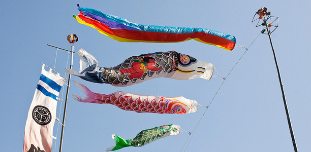Những lá cờ Koi (cá chép) vải đầy màu sắc được treo trên mái nhà hoặc hành lang chung cư của các gia đình có con trai.